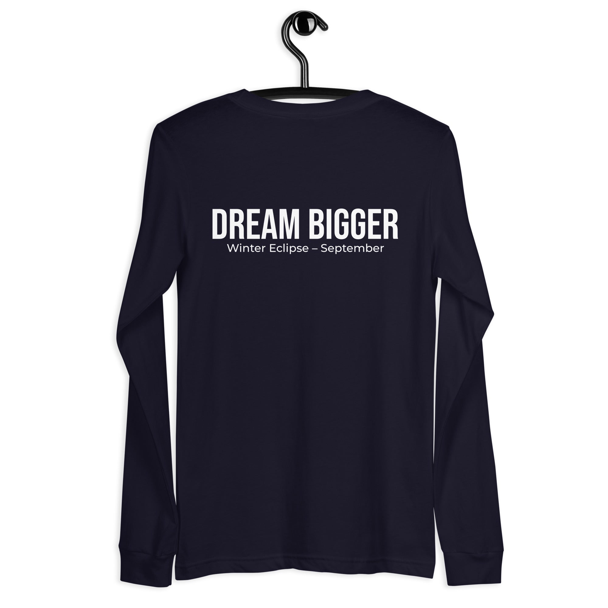 Versatile long sleeve tee made to elevate any fit. Soft, lightweight cotton with ribbed cuffs and a clean crew neck. On the back, the statement DREAM BIGGER with Winter Eclipse – September as the mark of this limited edition drop.